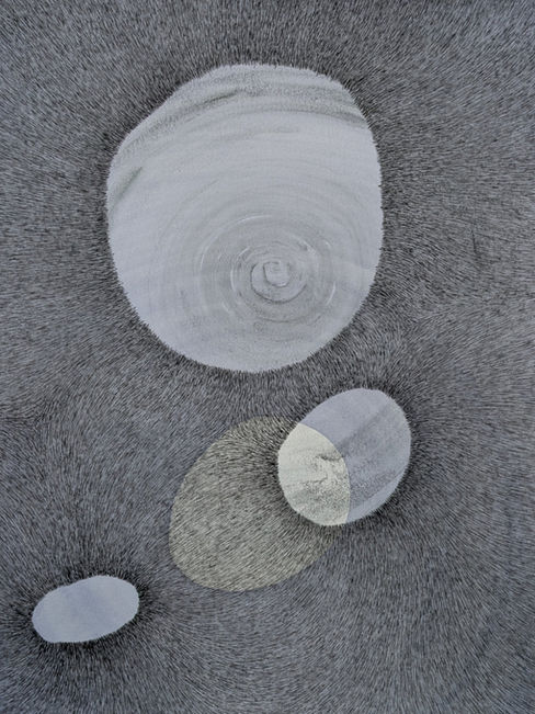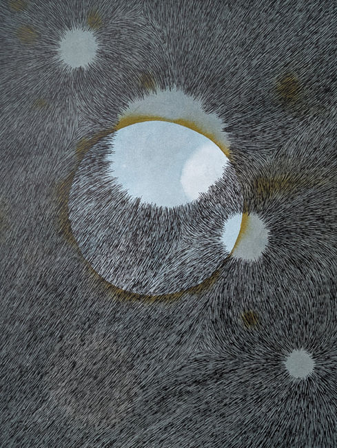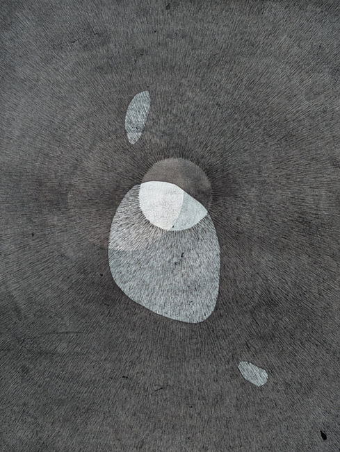 The images in my series „Breakthrough Moments“ are composed of multiple overlapping layers of ink, each covering the entire surface of the paper. Every layer contains at least one deliberately placed opening, some clearly defined, others seemingly in the process of forming.